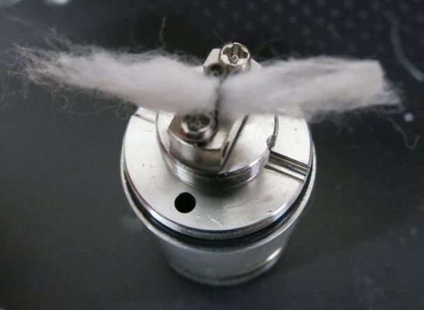 In an RDA, you don't have a tank and a disposable coil with wicking included. Instead, you'll have a semi-permanent coil. You'll have to add your own cotton through the coiled wire. It takes practice, but it's not difficult. First, you'll need some cotton (Cotton Bacon by Wick 'N' Vape is a good one to use, while Japanese cotton is preferred by some), a pair of scissors, tweezers, and your favorite juice.